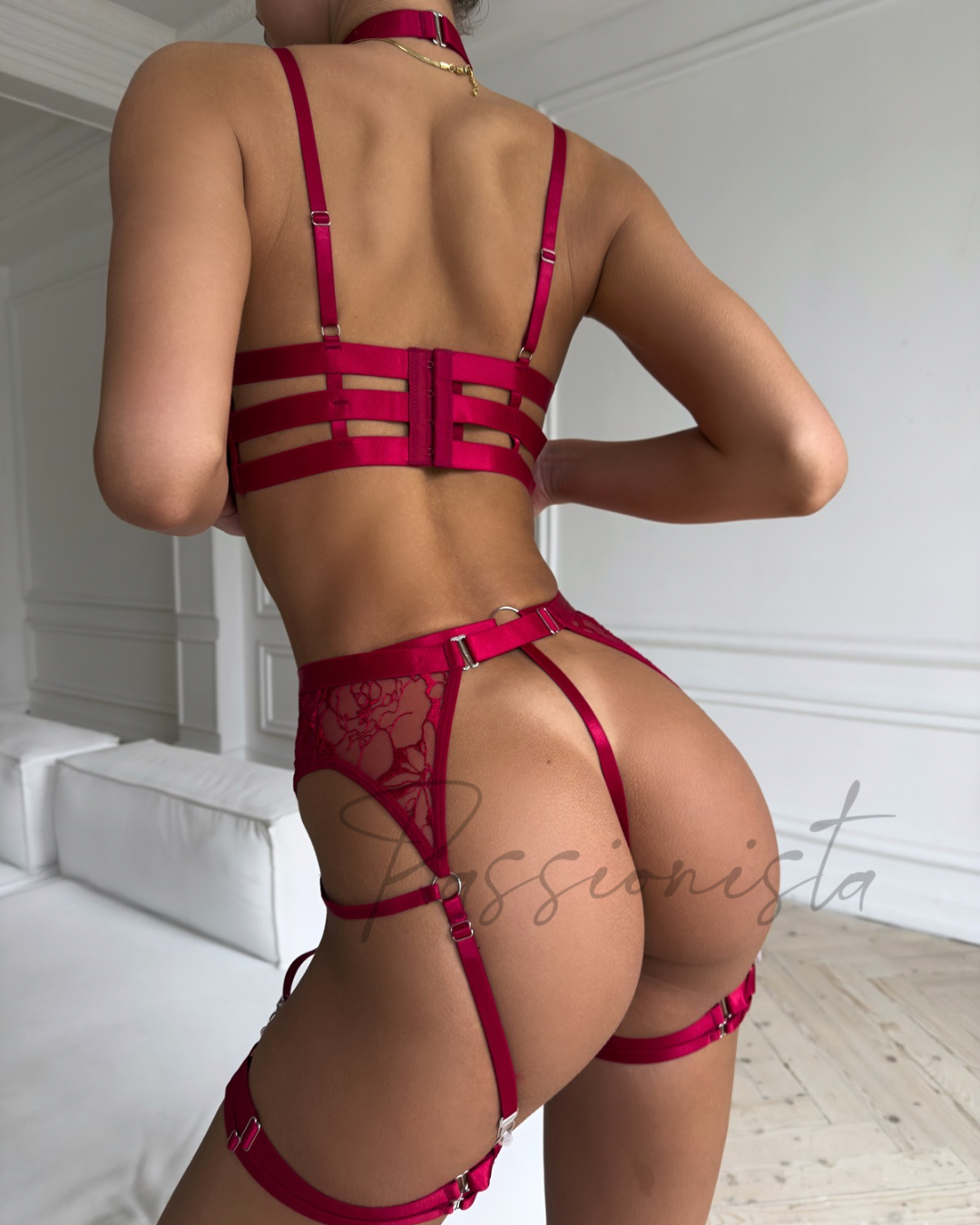 Komplet čine žičano ojačan brushalter sa čokerom, halteri sa podvezicama i tanga gaćice podesivog obima. Izrađen od prefinjenje čipke sa srebrnim metalnim detaljima.