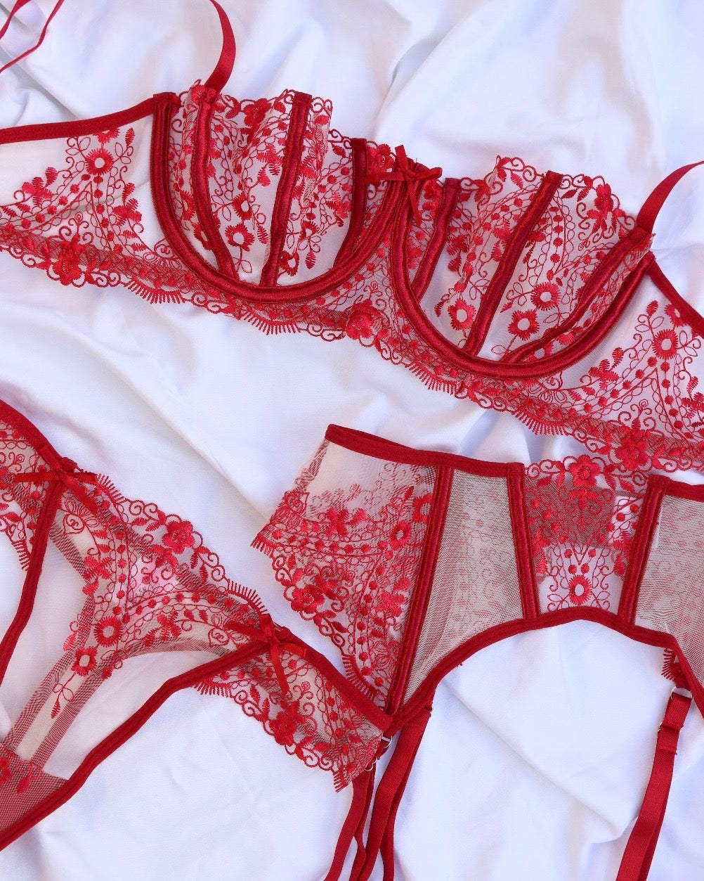 Komplet čine žičano ojačan brushalter, halteri i gaćice. Izrađen je od prefinjene čipke nude boje sa crnim/bordo vezom. Komplet može biti dopunjen čarapama za haltere.